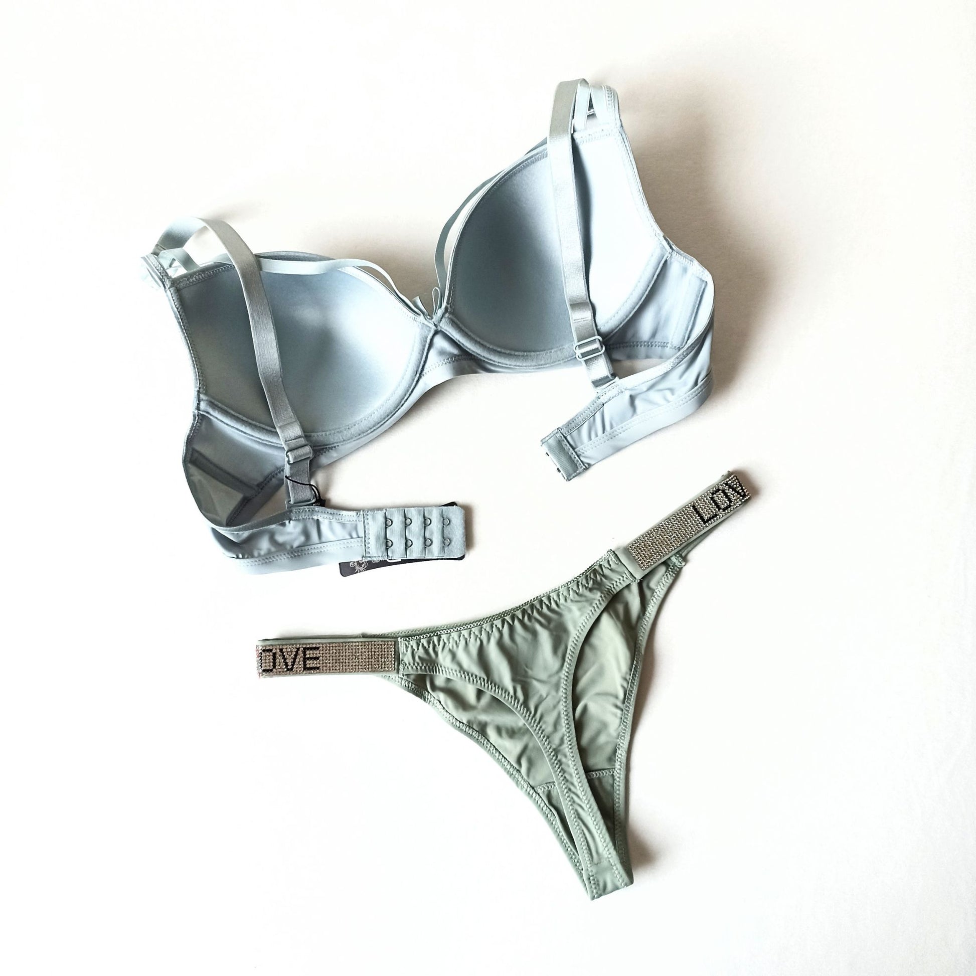 Jausmingas ir elegantiškas žalsvos spalvos apatinio trikotažo rinkinys, sukurtas moterims, kurios vertina komfortą ir subtilią prabangą. Lygi pakietinta liemenėlė su lankeliais ir išformuotais kaušeliais suteikia funkcionalų prilaikymą ir išryškina krūtinės formą. Priekyje kaušeliai dekoruoti juostelėmis, subtiliai pereinančiomis į petnešėles. Tai suteikia modeliui išskirtinumo. Reguliuojamos petnešos nugaroje leidžia prisitaikyti prie jūsų kūno linijų. Prie liemenėlės priderintos atitinkamos spalvos slidaus trikotažo stringai.