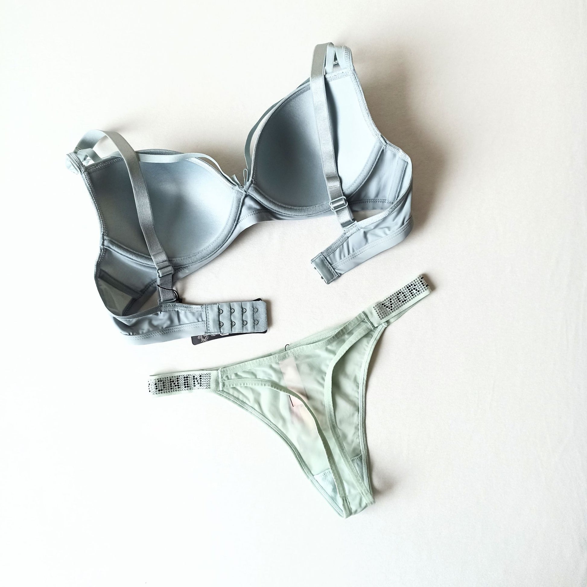 Jausmingas ir elegantiškas žalsvos spalvos apatinio trikotažo rinkinys, sukurtas moterims, kurios vertina komfortą ir subtilią prabangą. Lygi pakietinta liemenėlė su lankeliais ir išformuotais kaušeliais suteikia funkcionalų prilaikymą ir išryškina krūtinės formą. Priekyje kaušeliai dekoruoti juostelėmis, subtiliai pereinančiomis į petnešėles. Tai suteikia modeliui išskirtinumo. Reguliuojamos petnešos nugaroje leidžia prisitaikyti prie jūsų kūno linijų. Prie liemenėlės priderintos atitinkamos spalvos slidaus trikotažo, permatomi stringai.